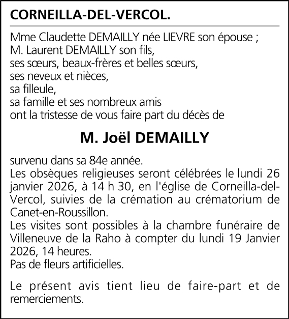 C’est avec une grande tristesse que nous vous annonçons le décès de Joël DEMAILLY survenu le jeudi 15 janvier 2026 à Cabestany.